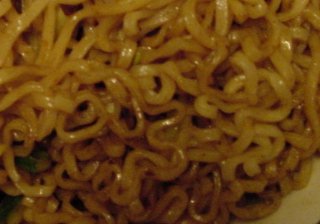 | 韓国式です。粉末のスープは別の鍋で少な目の湯 で溶いてから、面の上にかけました。台湾のものがラーメンっぽいのに対して、こち らはうどんっぽい。荒川さんの報告のようにこちらの方が面はしっかりしていて、食 べやすい。 | |